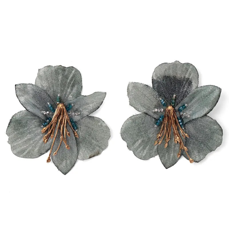 Cada pétalo está elaborado en tela prensada y cortada a mano, con un centro bordado cuidadosamente con mostacillas y pistilos en imitación cuero, creando volumen y movimiento natural. Su topo en acero inoxidable las hace perfectas para pieles sensibles, asegurando comodidad durante todo el día.