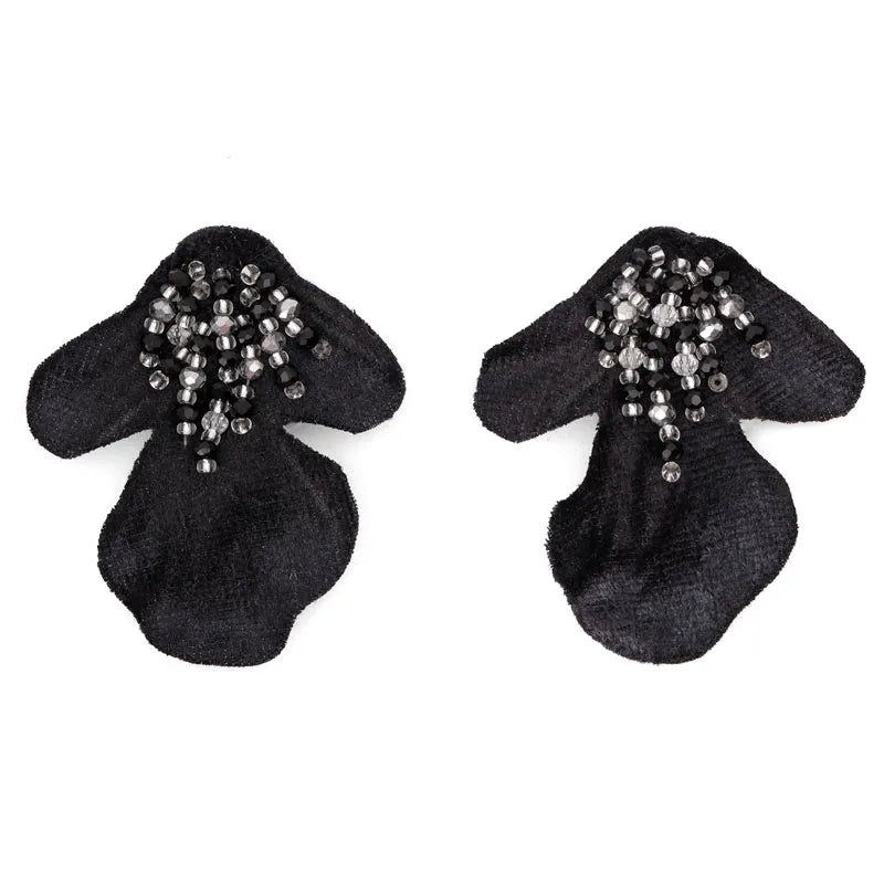 Son aretes medianos, en forma de botones de flores, es un homenaje a las flores pequeñas que crecen en el camino. Cada par está elaborado en tela prensada y cortada a mano, y en su centro bordamos delicadamente mostacillas una a una, creando un brillo sutil y orgánico. Combinalas perfectamente con nuestro Collar Veleña Negro o nuestra pulsera Veleña Negro.