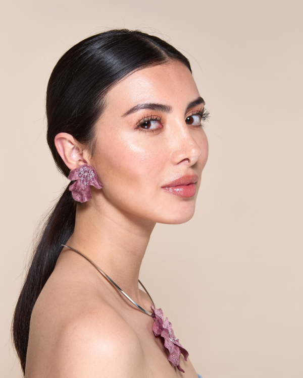 Son aretes medianos, en forma de botones de flores, es un homenaje a las flores pequeñas que crecen en el camino. Cada par está elaborado en tela prensada y cortada a mano, y en su centro bordamos delicadamente mostacillas una a una, creando un brillo sutil y orgánico. Combinalas perfectamente con nuestro Collar Veleña Negro o nuestra pulsera Veleña Negro.