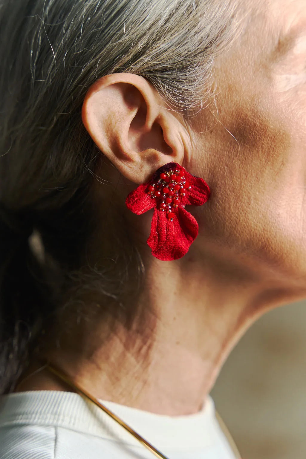 Son aretes medianos, en forma de botones de flores, es un homenaje a las flores pequeñas que crecen en el camino. Cada par está elaborado en tela prensada y cortada a mano, y en su centro bordamos delicadamente mostacillas una a una, creando un brillo sutil y orgánico. Combinalas perfectamente con nuestro Collar Veleña Negro o nuestra pulsera Veleña Negro.